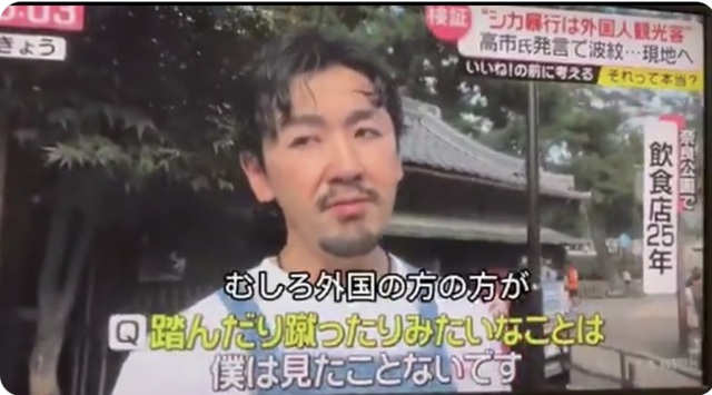 左下が日テレが出して来た「ガイド歴10年以上」の女性です。そしてもう一人「奈良公園で飲食店25年」の男性も出して来ました。そしたら元・自称迷惑系ユーチューバー、奈良市議会議員の「へずまりゅう」さんが、さっそく現地調査してはりました。
