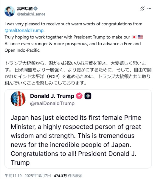 そして今日のビックリは、トランプさんが自らのSNS(Truth Social)で、高市さんに祝意を送ったということですね。そしたらすかさず高市さんが返信してはりました。さすが。