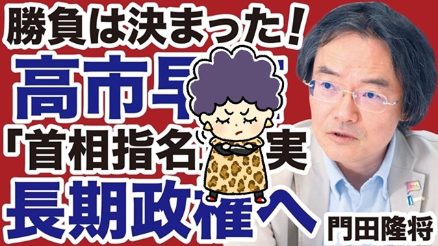 もはや勝負あった、というのが今の状況ですね。今、高市さんが各党首と次々に会談してはりますが、実はもうセレモニーみたいなもんです。最後には雪崩を打って、高市さんの大勝利となると思われます(【圧倒的支持】高市早苗が「首相指名」確実の情勢「長期政権」樹立へ【門田隆将✕デイリーWiLL】)。