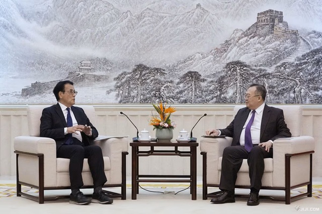 中国共産党の劉建超・中央対外連絡部長(右)と会談する立憲民主党の岡田克也前幹事長=21日、北京(代表撮影・時事)