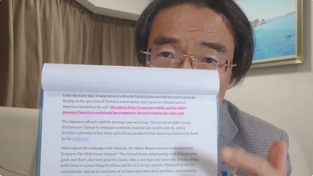 昨日は「【50】高市政権を襲う悪辣なマスコミの手口」と発信してはりました。高市さんがトランプさんとの電話会談で、発言を慎むように、と言われたという話は、「ウォールストリートジャーナル」の「中国」人記者の記事からや、という話でしたが、そもそもその記事の原文には逆のことが書いてあることを門田さんは、誌面を画面に映して言うてはりました。