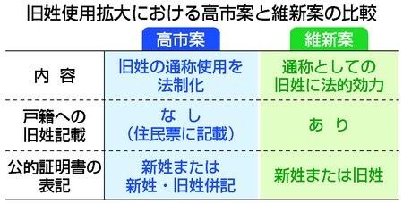 政府・与党は、結婚に伴って姓を変えた人による旧姓の通称使用を法制化する方向で調整に入った。関連法案を来年1月召集の通常国会に提出する。高市早苗首相(自民党総裁)が就任前にまとめた私案をベースに調整を進める方針だ。