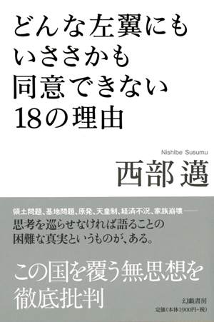 でも私はふと思いました。左翼、リベラルが徹底的に日本国民から嫌われるくらいにならんとあかんのとちゃうか、と。もうずいぶん経ちますが、西部邁氏の著書『どんな左翼にもいささかも同意できない18の理由』(幻戯書房、2012年刊)が出た時、私はのけぞったものでした。「いささかも」って、そこまで言う?と。でも14年後の今、それが証明されつつある、ということなんですね。