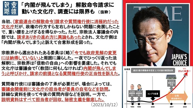 あ、この中の産経の記事のリンクはこちら(「内閣が飛んでしまう」 解散命令請求に動いた文化庁、調査には限界も)ですね。もう2年半前の記事ですが、この時点でかなりヤバい「調査」やと認識されていたようですね。