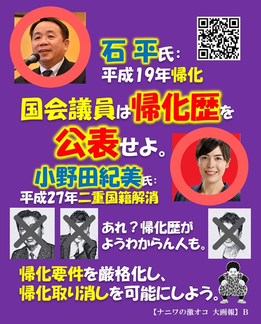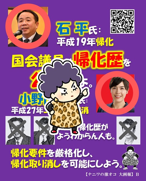 そして今日は再度、これを拡散させてください。【ナニワの激オコ 大画報】第20弾「国会議員は帰化歴を公表せよ」です。